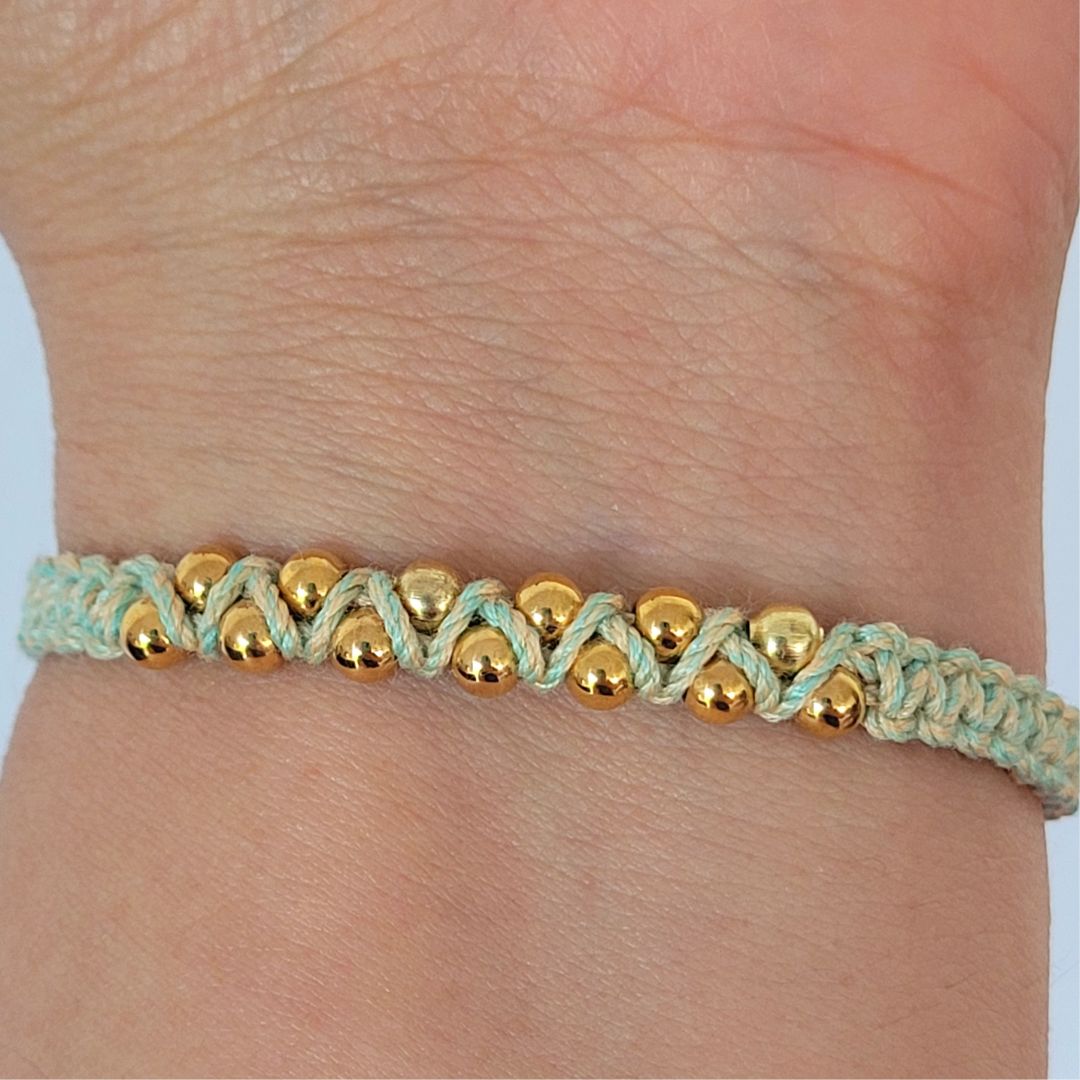 Elegante y minimalista, esta pulsera combina un trenzado en hilo color menta con balines en acero inoxidable, creando un diseño delicado y versátil. El acero inoxidable es resistente, duradero y mantiene su brillo con el tiempo. No se oxida ni mancha, lo que lo hace perfecto para el uso diario. Además, es hipoalergénico, ideal para pieles sensibles, y ofrece una apariencia elegante.