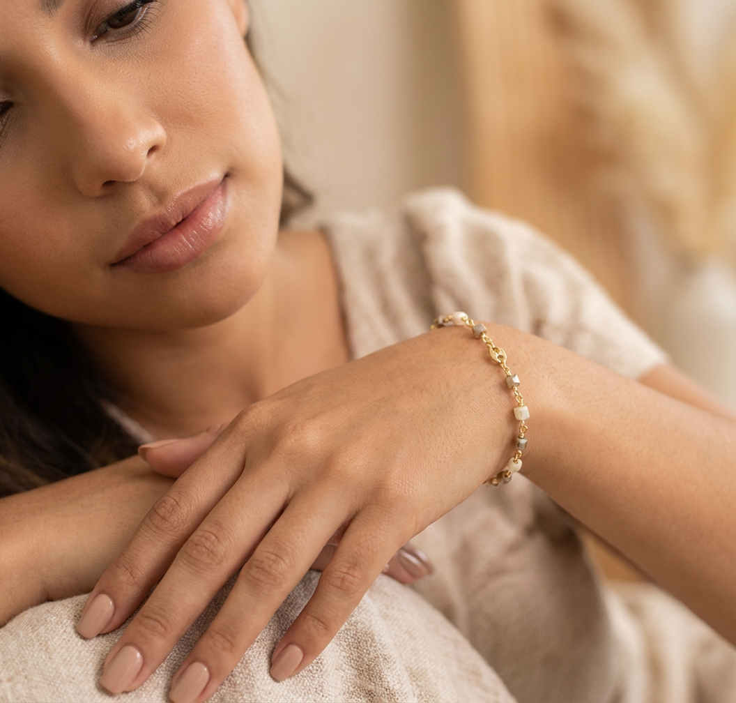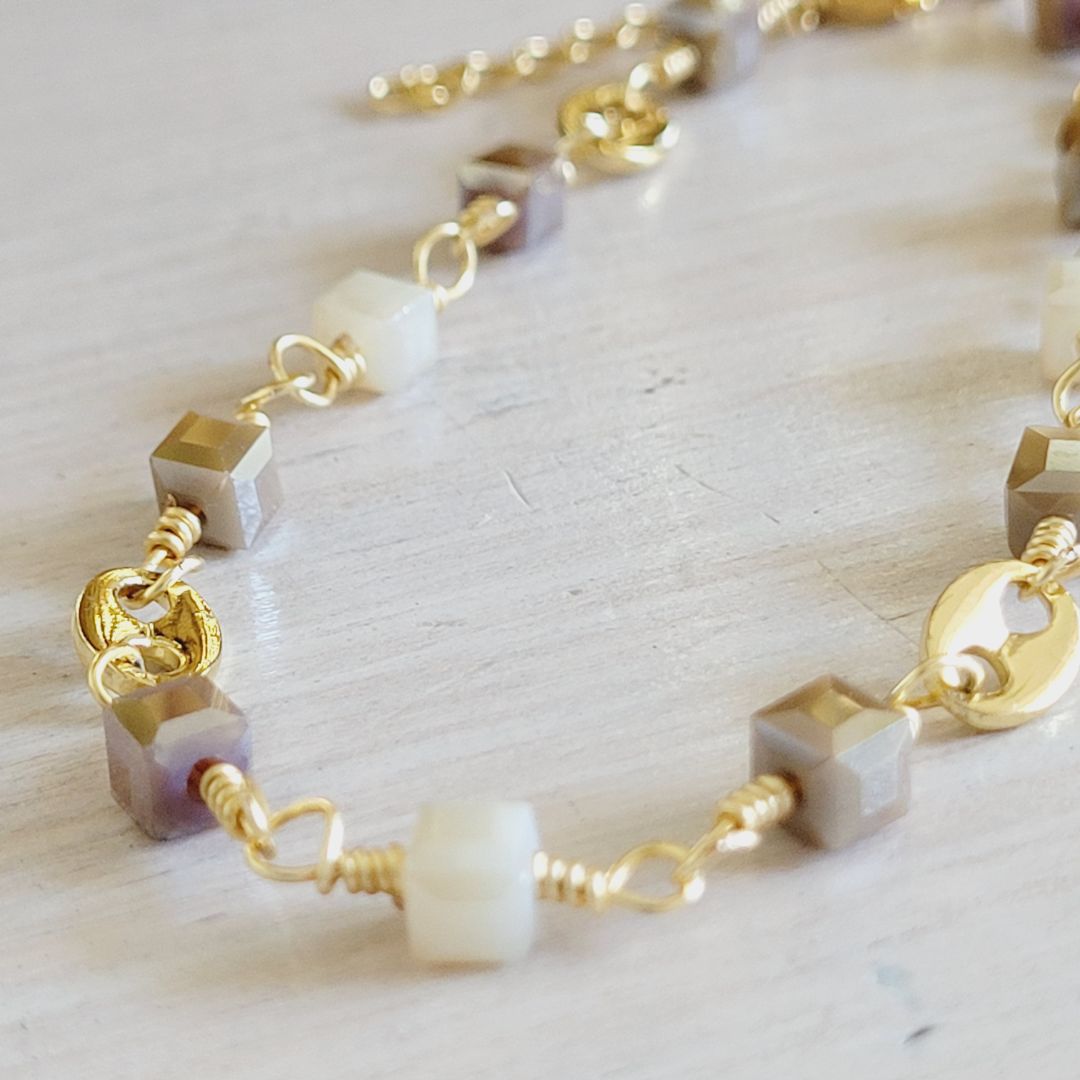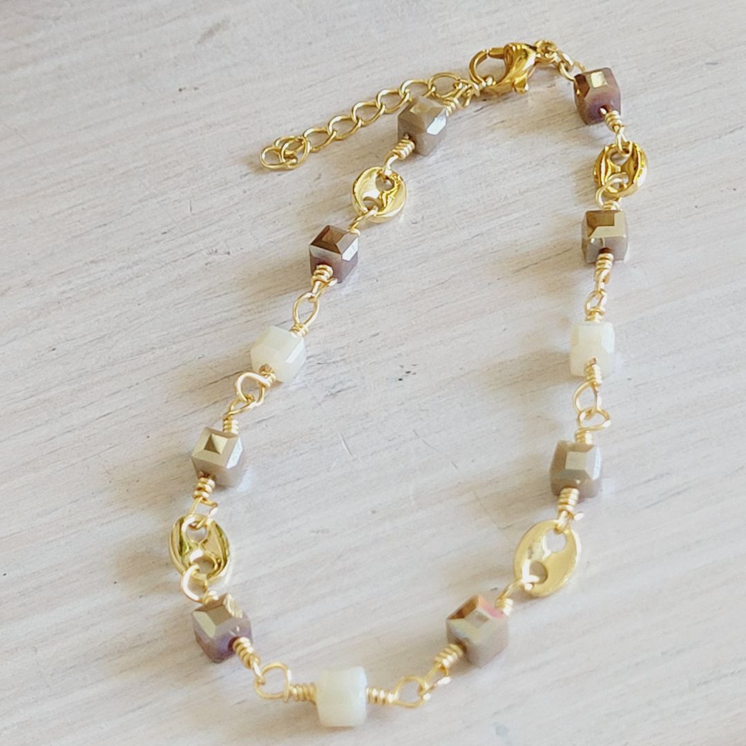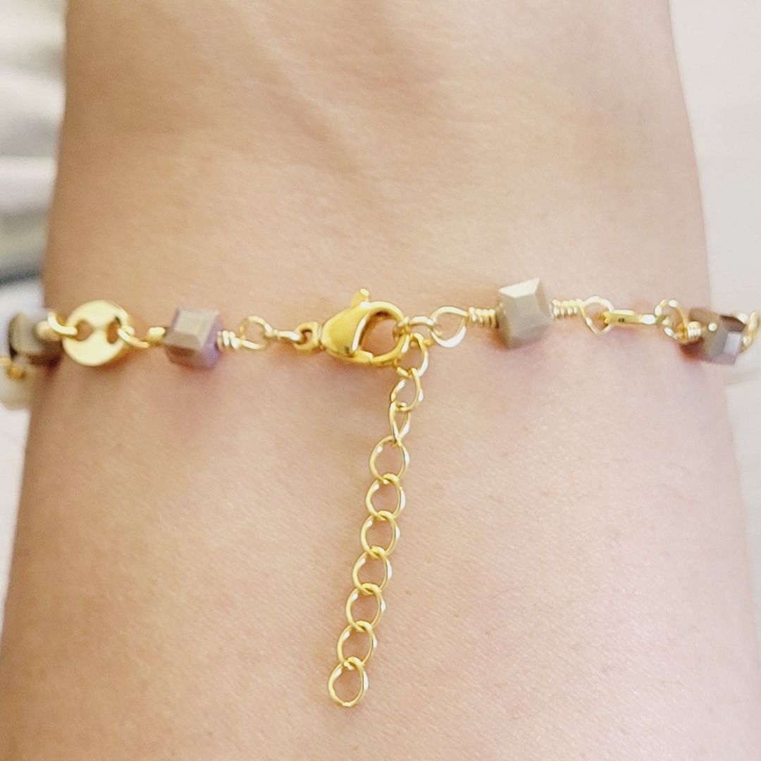 Elegante y delicada pulsera, elaborada con la técnica del alambrismo y cristales checos cuadrados en tonos beige, eleva y destaca a donde vayas, los detalles son en baño de oro 18k