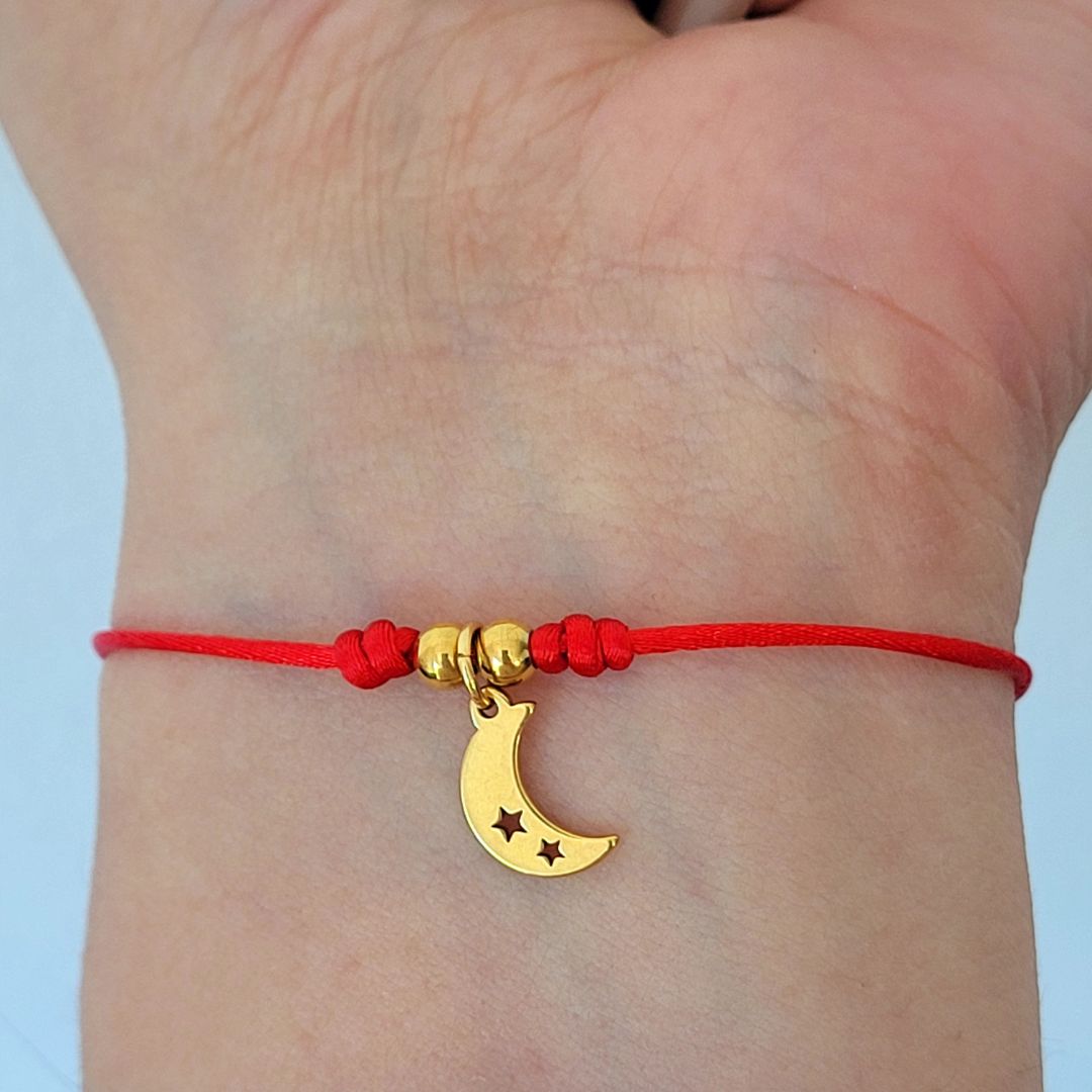 Delicada y sobria pulsera ajustable con dije de luna, los detalles son en baño de oro y acero inoxidable.