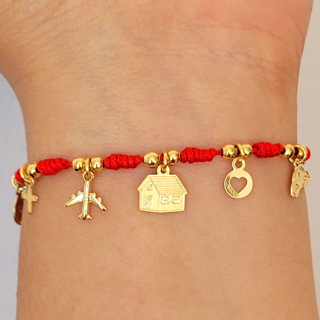 Hecha en hilo rojo con detalles en baño de oro, esta pulsera está diseñada para atraer buenas vibras y recordarte siempre tus objetivos: