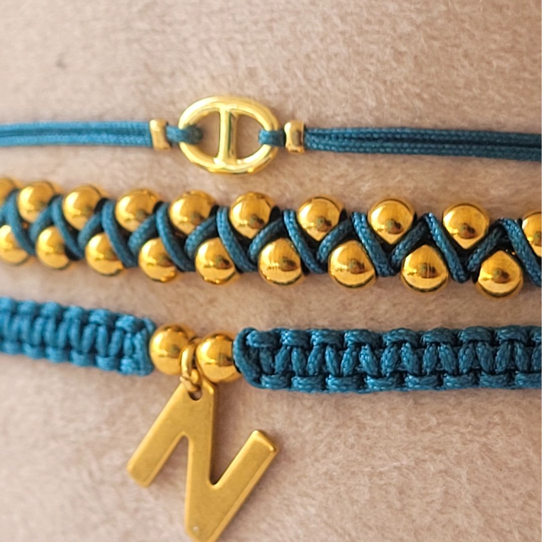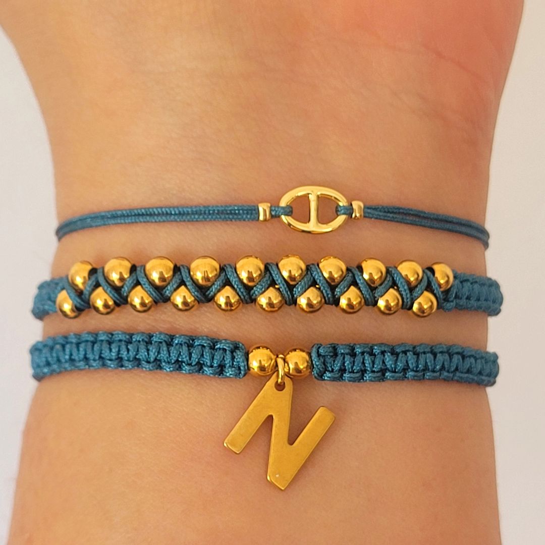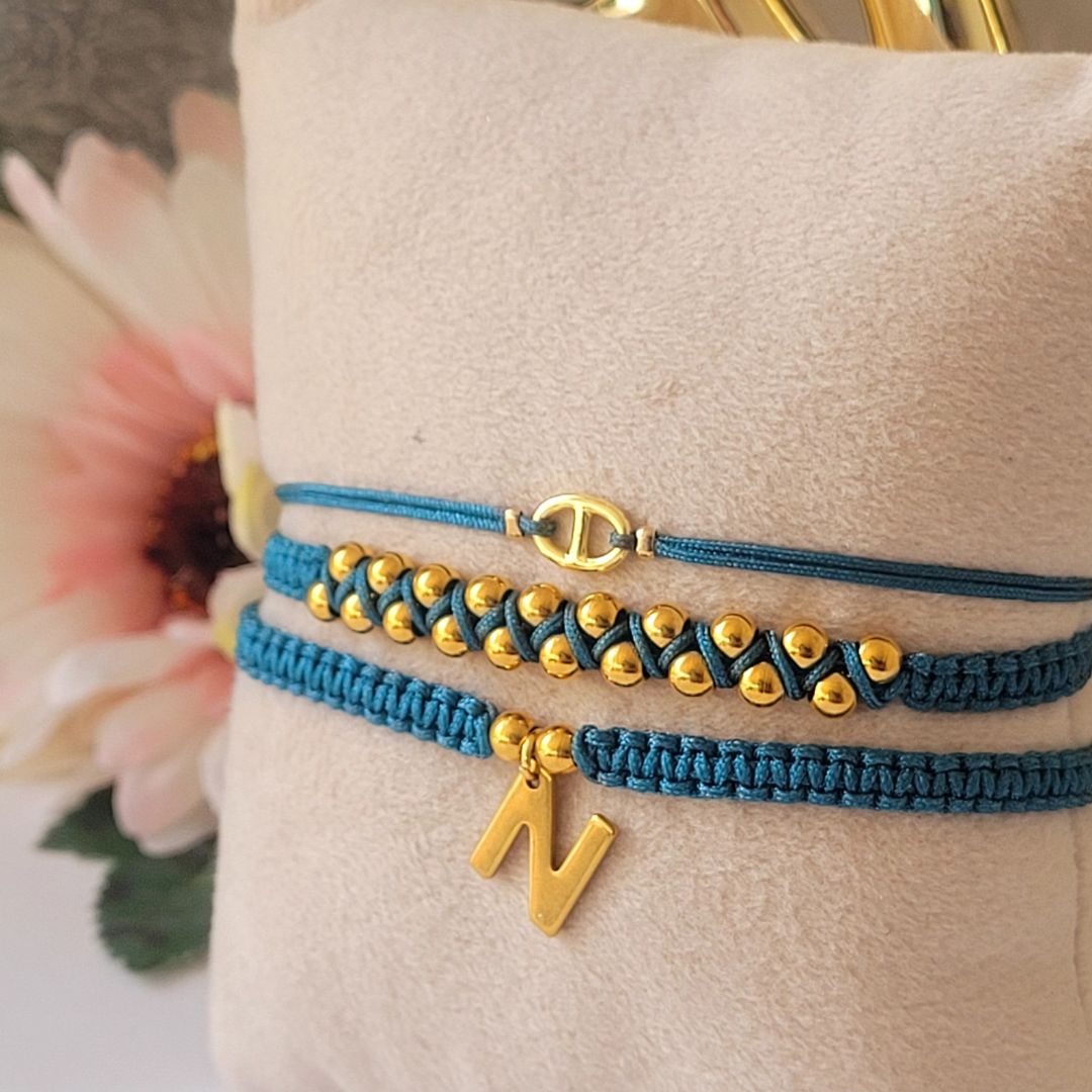 Set ajustable tejida en tono Turquesa, personalízalo indicándonos la letra que necesites y la fabricamos para ti, los detalles son en acero inoxidable y baño de oro 18k.